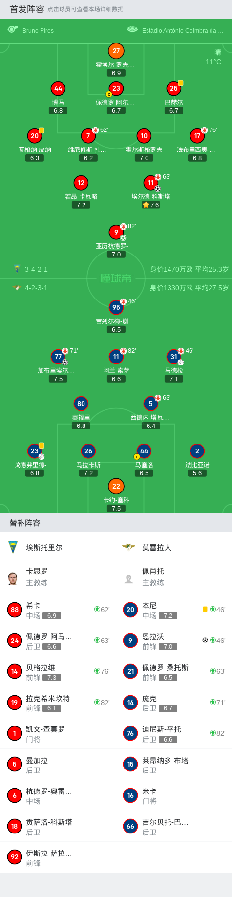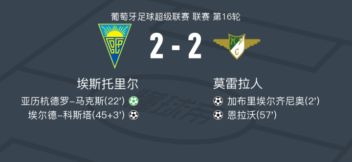 埃斯托里尔2-2莫雷拉人,加布里埃尔齐尼奥破门,恩拉沃扳平