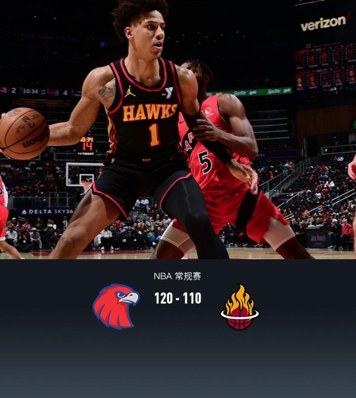第四节老鹰亨特拿下8分,热火阿德巴约拿下6分,最终老鹰120-110战胜热火