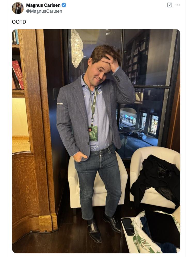 看到国际象棋联合会的声明后,马格努斯-卡尔森在社交媒体发布了身着牛仔裤的照片作出回应,并配文“OOTD(今日穿搭)”。