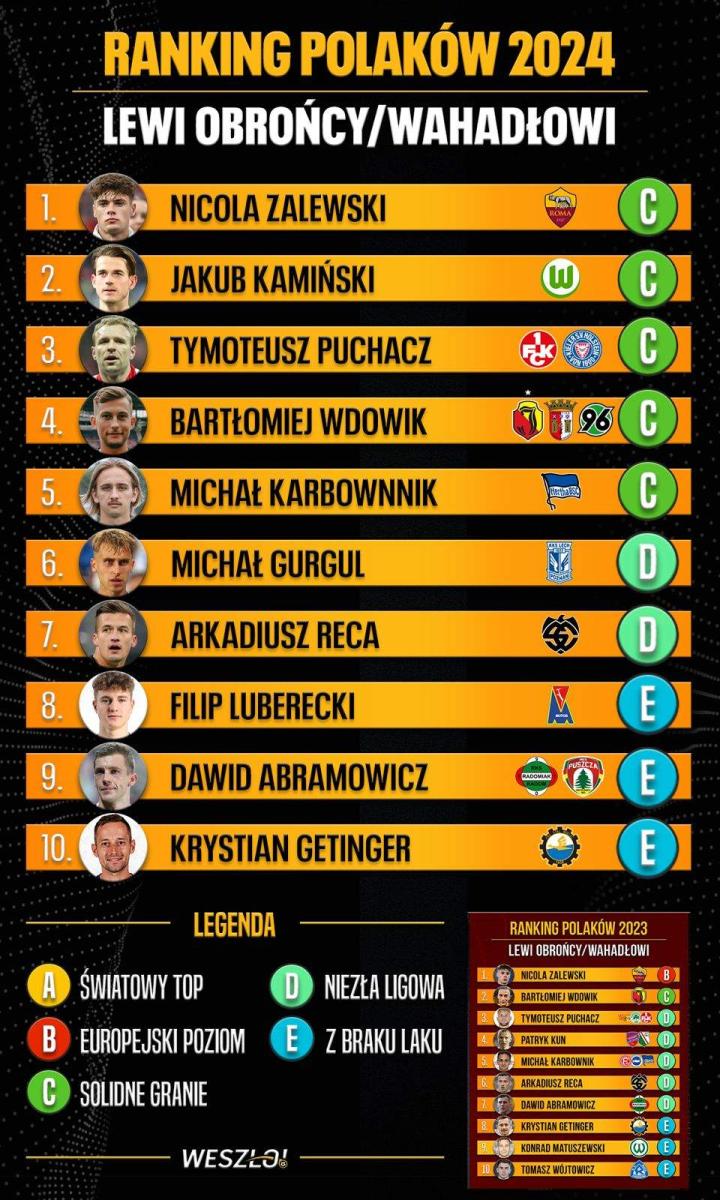 波兰球迷俱乐部波兰媒体Weszło发布了2024年的波兰球员年终排名,第四份榜单对所有波兰左后卫和左边翼卫进行了点评。扎莱夫斯基连续两年领跑,卡明斯基、普哈奇分列二三名。