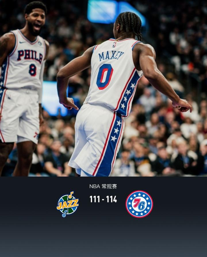 第四节爵士森萨博拿下7分,76人马克西拿下12分,最终爵士111-114不敌76人