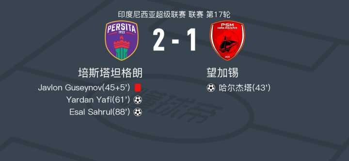 在印度尼西亚超级联赛第17轮的比赛中,培斯塔坦格朗坐镇主场迎战望加锡。比赛中,望加锡的哈尔杰塔率先为球队取得进球。随后,培斯塔坦格朗的Javlon Guseynov被罚下场,球队面临挑战。然而,培斯塔坦格朗并未气馁,裴信泳两次送出精彩助攻,先后帮助Yardan Yafi和Esal Sahrul成功破门。最终,培斯塔坦格朗以2-1逆转战胜望加锡,取得了这场比赛的胜利。