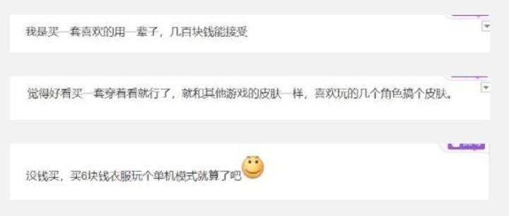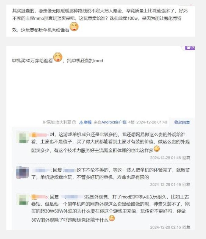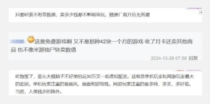 面对天价时装,玩家们有不同的看法。有人认为《燕云十六声》是免费游戏,不但没有付费月卡,也没有卖数值。时装真的只是时装,就只有好看的作用而已。花30万元买套虚拟服装,不是人傻就是钱多。