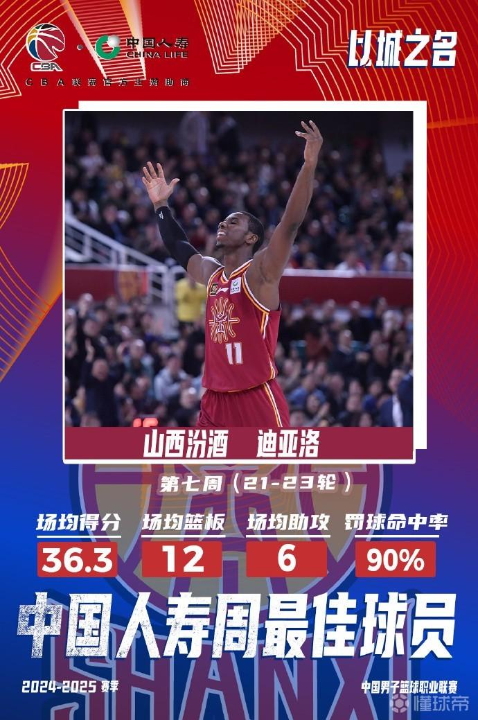 迪亚洛本周出战3场,场均上场34分钟,能够得到36.3分12篮板6助攻1.3抢断1盖帽的全面数据。尤其在古德温缺阵的2场比赛中,迪亚洛在攻防两端承担了更多责任,他在对阵深圳男篮和广厦男篮的比赛中连续砍下40+,率队取得两连胜。山西男篮也在常规赛半程过后高居联赛积分榜第二位。