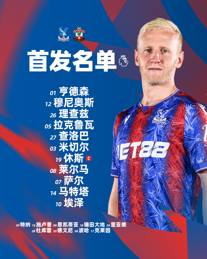 水晶宫 vs 南安普顿丨首发公布 理查兹首发出战,休斯担任场上队长