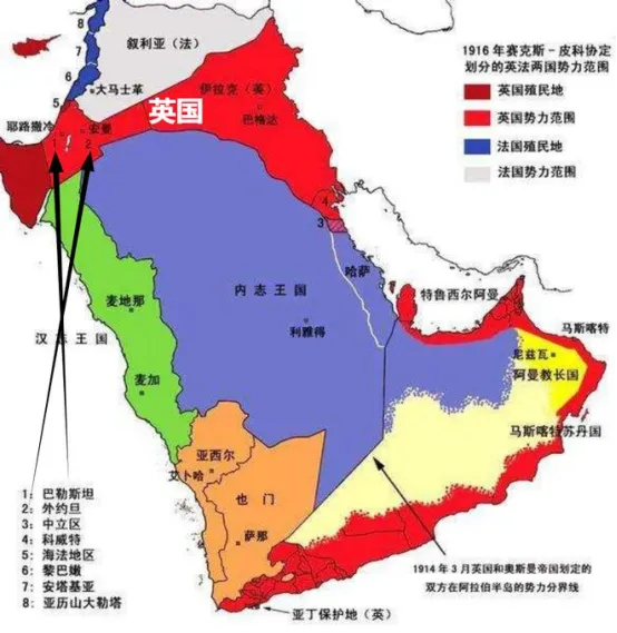 战前,英、法(俄国也参与)签署了秘密瓜分阿拉伯地区的《赛克斯-皮克协定》。
