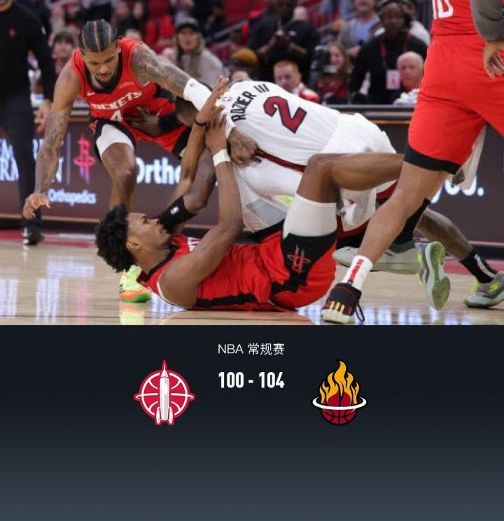 第四节火箭范弗利特拿下8分,热火希罗拿下6分,最终火箭100-104不敌热火