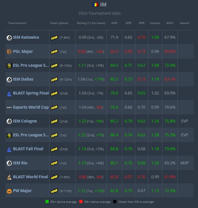 现效力于NAVI的25岁选手Mihai “iM” Ivan获评HLTV年度TOP16,成为罗马尼亚历史上首次入选TOP20的选手。在2024年,iM帮助NAVI获得4冠(哥本哈根Major、电竞世界杯、EPL-S20赛季、IEM里约)3亚(BLAST春决、IEM科隆、BLAST秋决),而他自己也获得了IEM里约站MVP以及IEM科隆和EPL-S20两项赛事EVP,堪称大丰收的一年。