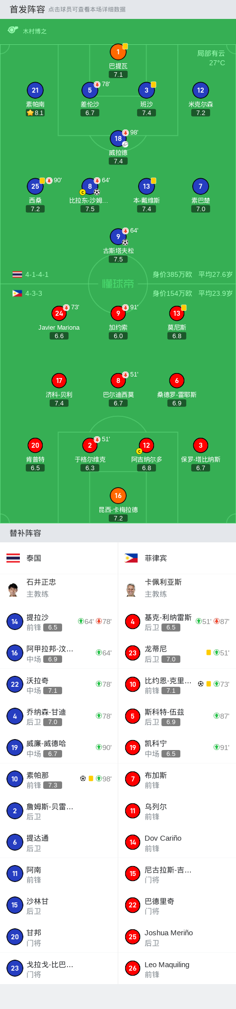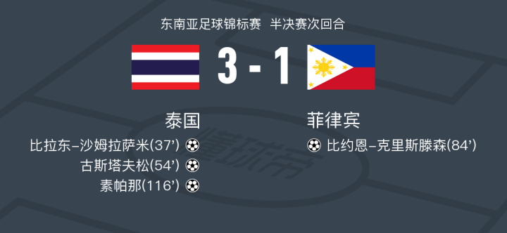 泰国3-1菲律宾,素帕那、古斯塔夫松破门