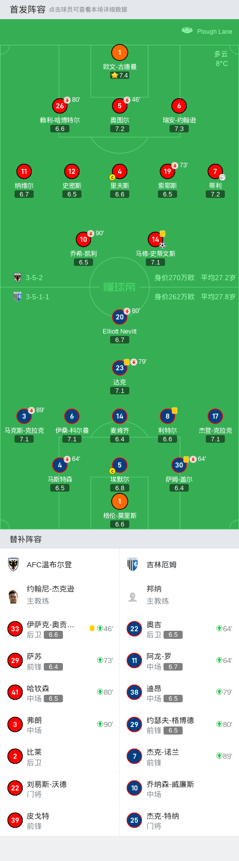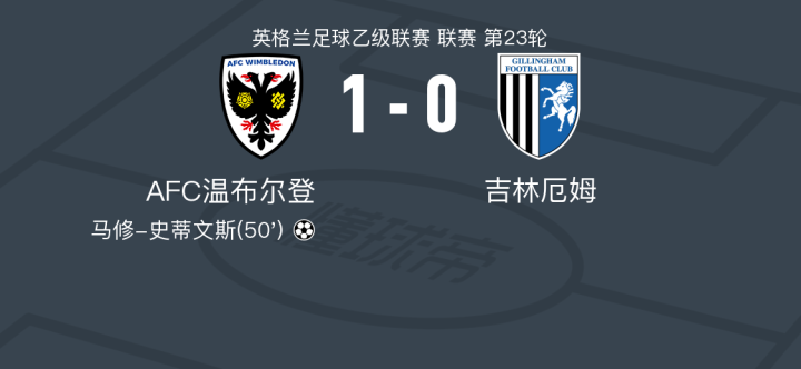 在英格兰足球乙级联赛第23轮的较量中,AFC温布尔登坐镇主场迎战吉林厄姆。比赛中,AFC温布尔登的马修-史蒂文斯在蒂利的助攻下成功破门,为球队取得领先。最终,AFC温布尔登以1-0小胜吉林厄姆,赢得了这场比赛的胜利。