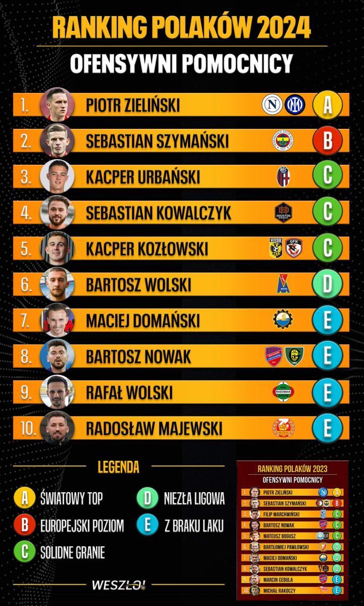 波兰球迷俱乐部波兰媒体Weszło发布了2024年的波兰球员年终排名,第七份榜单对所有波兰进攻型中场进行了点评。泽林斯基领衔,希曼斯基、乌尔班斯基分列二三名。
