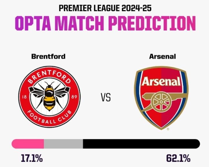 Opta的超级计算机在赛前进行10000次模拟,预测阿森纳赢球概率62.1%,布伦特福德取胜可能性17.1%,平局的概率为20.8%。
