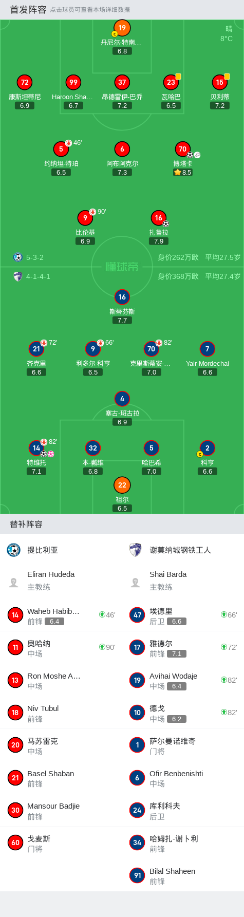 在以色列足球超级联赛第16轮的比赛中,提比利亚坐镇主场迎战谢莫纳城钢铁工人。比赛中,提比利亚的博塔卡表现出色,他先是助攻扎鲁拉成功破门,随后自己也攻入一球。谢莫纳城钢铁工人的特维托同样在比赛中取得进球,但不幸的是,他在一次防守中自摆乌龙,为对手送上大礼。最终,提比利亚以3-1的比分战胜谢莫纳城钢铁工人,取得了本场比赛的胜利。