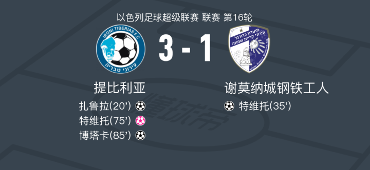 提比利亚3-1谢莫纳城钢铁工人,博塔卡1射1传,扎鲁拉破门