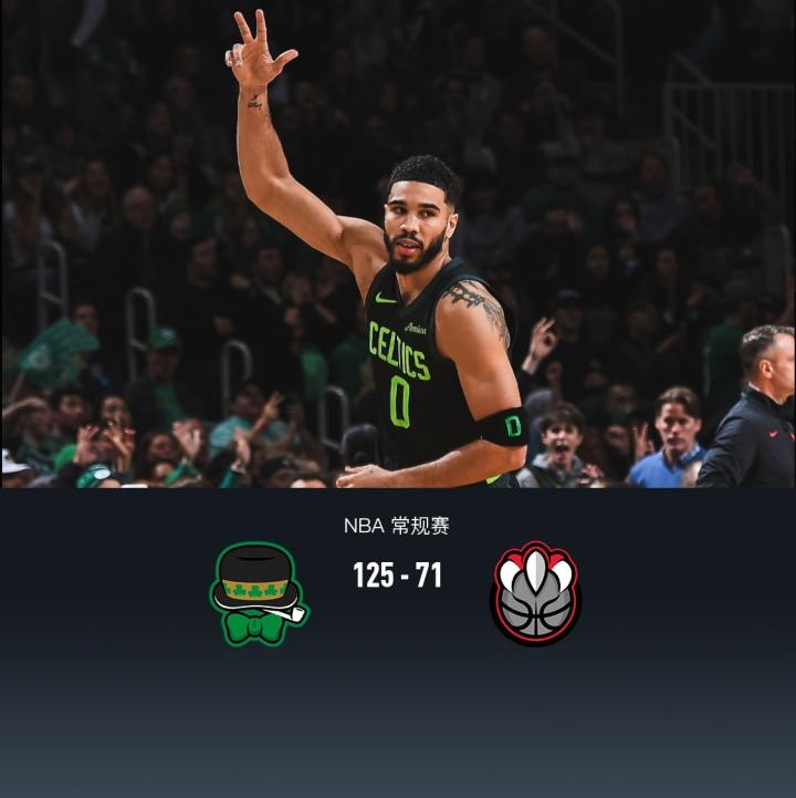 第四节凯尔特人沃尔什拿下10分,猛龙贾米森-巴特尔拿下6分,最终凯尔特人125-71战胜猛龙