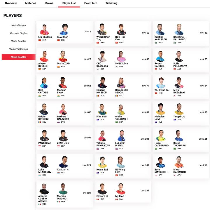 混双:林诗栋/蒯曼、黄镇廷/杜凯琹、卡尔森/C-卡尔伯格、罗伯勒斯/肖瑶茜、赵大成/申裕斌、加多斯/波尔卡诺娃、玛纳什-沙/奇塔莱、E-约内斯库/斯佐克斯、姚钧涛/长崎美柚、O-约内斯库/巴拉佐娃、卢伟/高桥-朱丽叶、林文政/刘杨子、冯耀恩/曾尖、皮斯特耶/库库洛娃、卡尔德拉诺/高桥-布鲁娜、姆拉德诺维奇/倪夏莲、裴焕/吴咏琳、松岛辉空/张本美和、马德里德/埃塞维斯、李元璋/廖桂华