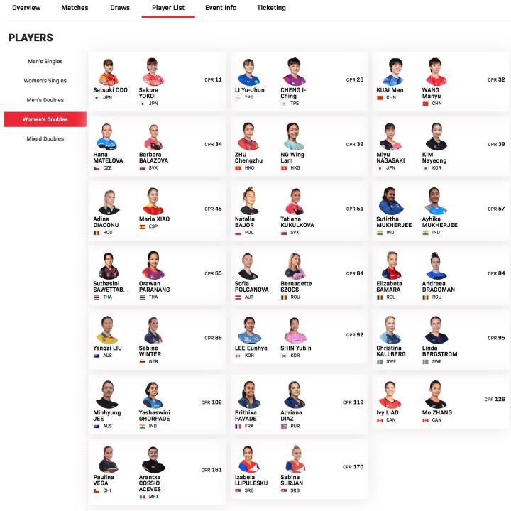 女双:大藤沙月/横井咲樱、郑怡静/李昱谆、王曼昱/蒯曼、马特洛娃/巴拉佐娃、朱成竹/吴咏琳、长崎美柚/金娜英、迪亚克努/肖瑶茜、巴约/库库洛娃、S-穆克吉/A-穆克吉、素塔西尼/帕拉南、波尔卡诺娃/斯佐克斯、萨马拉/德拉戈曼、刘杨子/温特、申裕斌/李恩惠、伯格斯特隆/C-卡尔伯格、池旼亨/戈尔帕德、迪亚兹/帕瓦德、张墨/廖桂华、维加/埃塞维斯、卢普雷斯库/苏尔詹