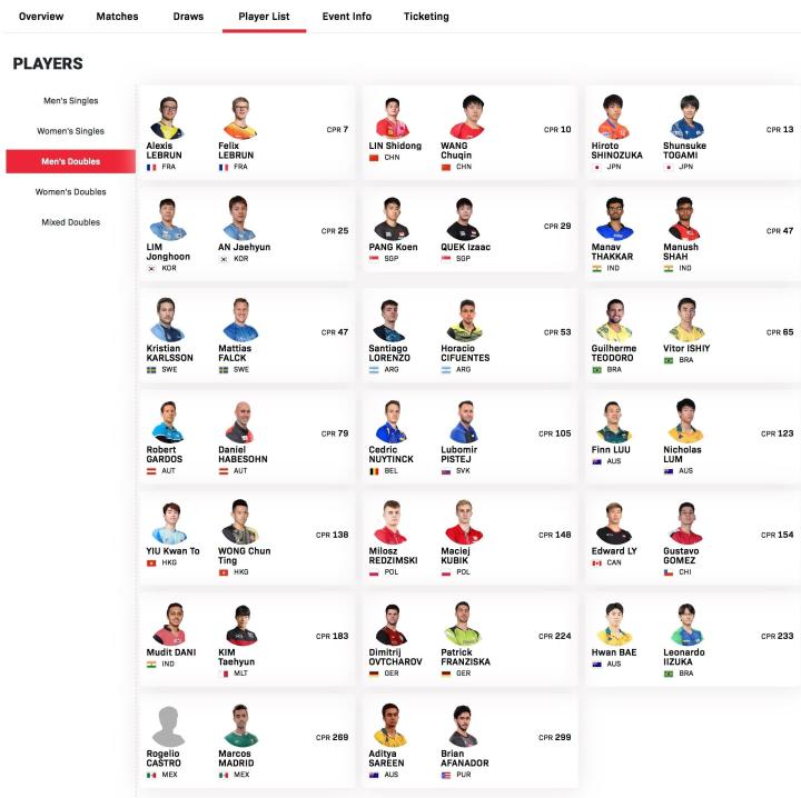 男双:A-勒布伦/F-勒布伦、王楚钦/林诗栋、户上隼辅/篠塚大登、林钟勋/安宰贤、冯耀恩/郭勇、塔卡/玛纳什-沙、卡尔森/法尔克、洛伦佐/西福恩特斯、特奥多罗/维特-艾什、加多斯/哈贝松、努伊提克/皮斯特耶、林文政/卢伟、黄镇廷/姚钧涛、雷德齐姆斯基/库比克、李元璋/戈麦斯、达尼/金泰勋、奥恰洛夫/弗朗西斯卡、裴焕/莱昂纳多、马德里德/卡斯特罗、萨林/阿凡纳多尔