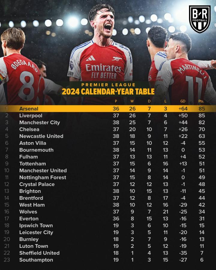2024自然年英超积分榜: 五大联赛仅有英超自然年榜首阿森纳,在联赛中不是榜首!