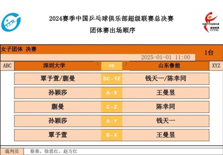 北京时间1月1日,乒超联赛女团决赛将于11:00正式开打。在第二盘比赛中,我们将看到现女单世界排名第一孙颖莎和世界排名第二王曼昱的对决。