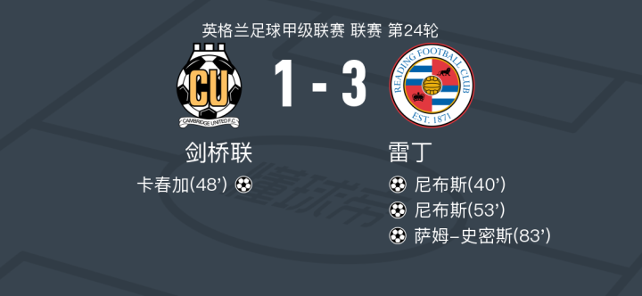 在英格兰足球甲级联赛第24轮的较量中,剑桥联坐镇主场迎战雷丁。比赛中,雷丁的尼布斯表现出色,成功打入两球,展现了强大的进攻能力。剑桥联的卡春加也不甘示弱,在队友卡森斯的助攻下为球队扳回一城。然而,雷丁的萨姆-史密斯在比赛后期再度破门,帮助球队锁定胜局。最终,雷丁以3比1的比分战胜剑桥联,取得了本场比赛的胜利。