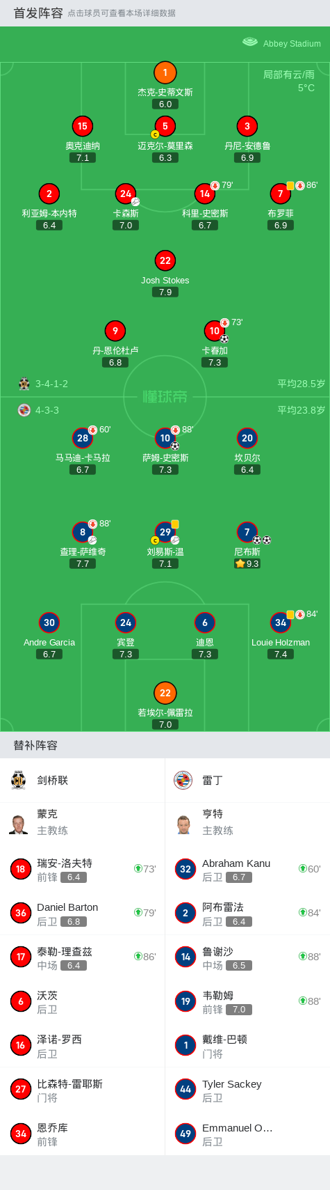雷丁3-1剑桥联,尼布斯两球,萨姆-史密斯破门