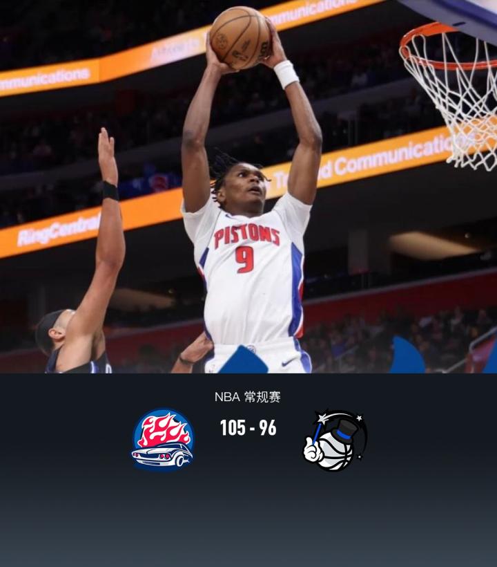 第四节活塞蒂姆-哈达威拿下10分,魔术萨格斯拿下8分,最终活塞105-96战胜魔术