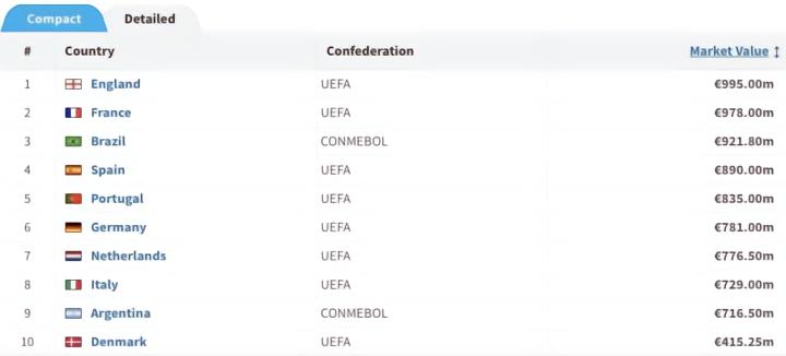 德转国家队身价排行榜:英格兰9.95亿欧登顶,法国队第二