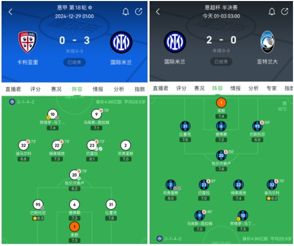得到双重光环加持,这场意超杯半决赛似乎悬念不大。同上周末的联赛时相比,加斯佩里尼对亚特兰大的首发阵容做出多处调整,反而是此前一直在进行深度轮换的小因扎吉使用了同一班人马。这一方面是因为国际米兰近期的赛程较为轻松,小因扎吉希望在其擅长的国内杯赛中有所作为,另一方面就是帕瓦尔和阿切尔比还在养伤,劳塔罗好不容易找回的进球感觉需要延续,国米的人员储备情况不具备执行深度轮换的条件。