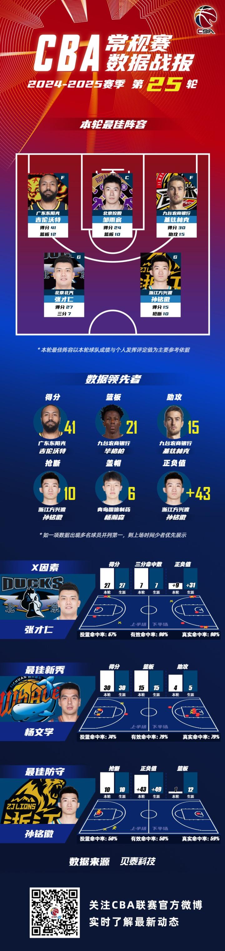 1月3日,CBA联赛官方公布常规赛第25轮最佳阵容,本轮飚中7记三分砍下27分均创生涯新高的北京队后卫张才仁领衔,北控内线邹雨宸和广厦后卫孙铭徽入选,一同入围的还有广东队外援吉伦沃特和吉林队外援基兹林克。