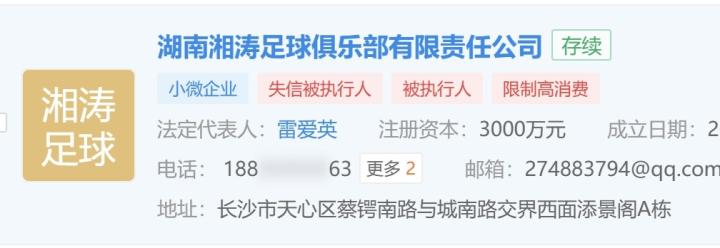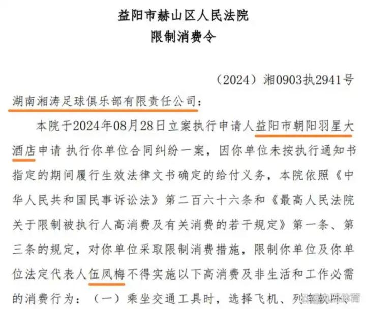 准入存疑?湖南湘涛足球俱乐部因22万被执行金额被限制高消费