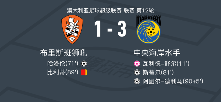 第11分钟,布里斯班狮吼球员瓦利德-舒尔自摆乌龙。