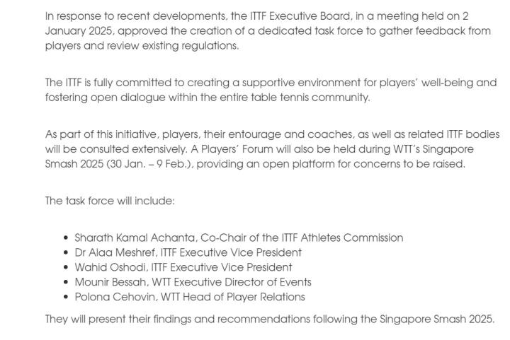 针对最近的事态发展,ITTF执行局在 2025年1月2日举行的会议上批准成立一个专门的工作组,负责收集运动员的反馈意见并审查现有的规定。