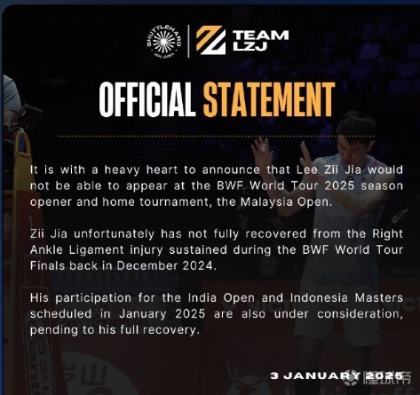 李梓嘉团队声明:因右脚踝伤势尚未康复,李梓嘉退出马来西亚公开赛十月孤城chasing @懂球帝2025-01-03 22:07北京时间1月3日,马来西亚羽毛球运动员李梓嘉团队发布官方声明,李梓嘉将因伤退出2025马来西亚公开赛。在官方声明中,其团队表示李梓嘉在上个月的年终总决赛期间遭遇了右脚踝韧带撕裂,目前还并未完全康复。之后的2025印度公开赛和印尼公开赛能否参加,也将视康复情况而定。相关阅读【总决赛因伤退赛,李梓嘉团队:球员右脚踝韧带损伤,伤势可控】【羽联总决赛男单:李诗沣收李梓嘉退赛礼,结束小组赛】展开更多