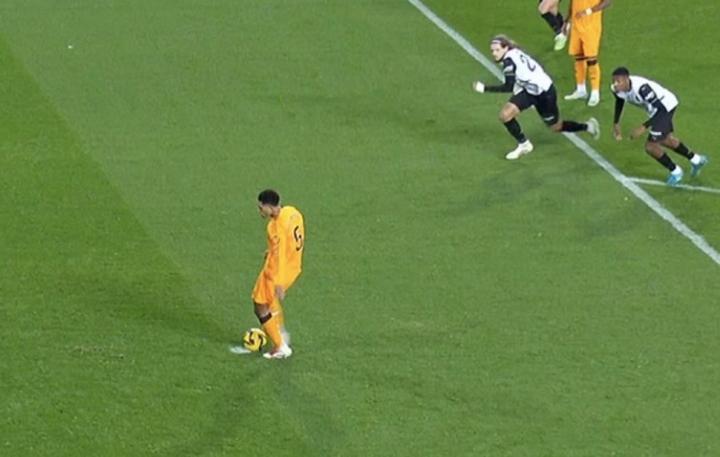 根据回放显示,在贝林厄姆罚点球时,瓦伦西亚门将迪米特列夫斯基明显提前移动离开了球门线。随后,贝林的点球踢中了球门框,点球罚失。