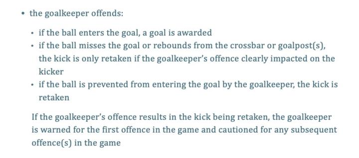 • 如果守门员的犯规导致重踢,则守门员因比赛中的第一次犯规而受到警告,并对比赛中的任何后续犯规受到警告。