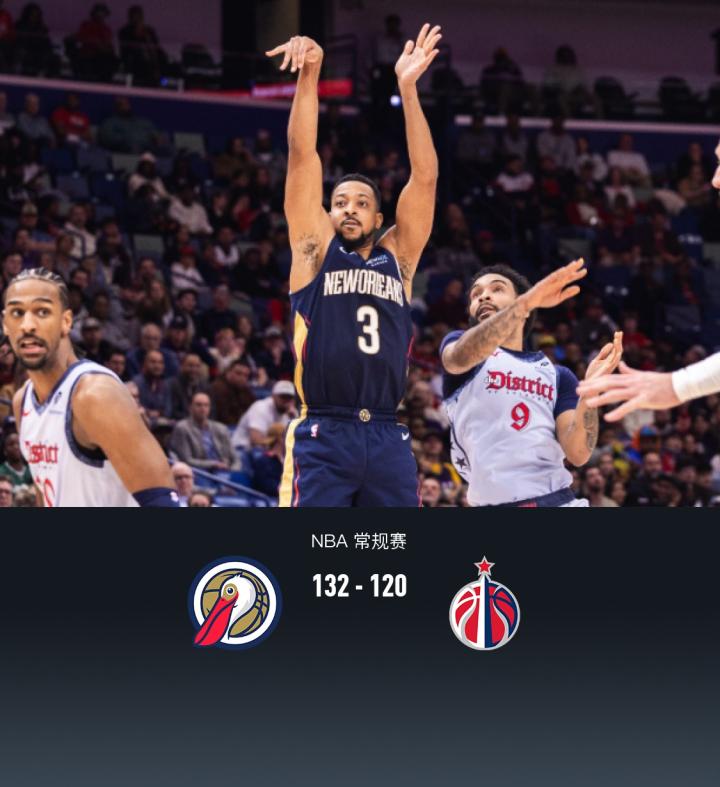 第四节鹈鹕CJ-麦科勒姆拿下16分,奇才亚历克斯-萨尔拿下6分,最终鹈鹕132-120战胜奇才