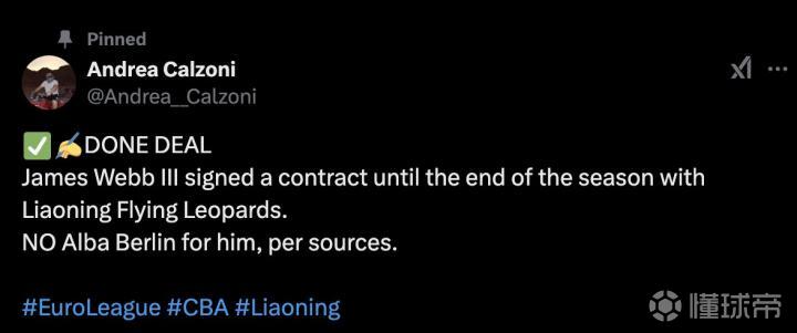 Andrea Calzoni在个人社交媒体表示:詹姆斯-韦伯三世与辽宁飞豹俱乐部签订了一份合同,直到本赛季结束。