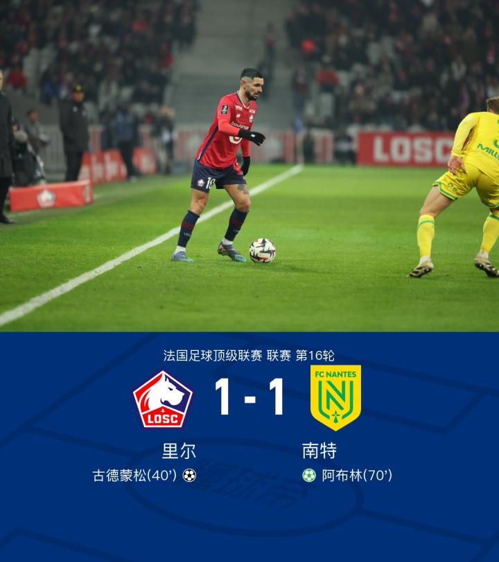 在法国足球顶级联赛第16轮的较量中,里尔坐镇主场迎战南特。比赛中,里尔的古德蒙松率先为球队取得进球,展现了出色的个人能力。随后,南特的阿布林通过点球机会扳平比分,帮助球队稳住了局势。最终,双方以1-1握手言和,各取一分。