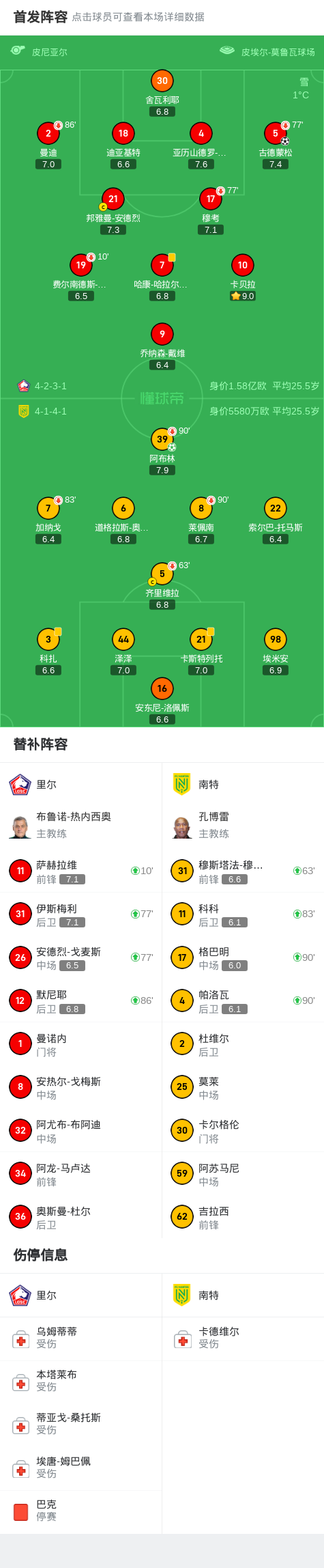 里尔1-1南特,古德蒙松补射破僵,阿布林点射扳平