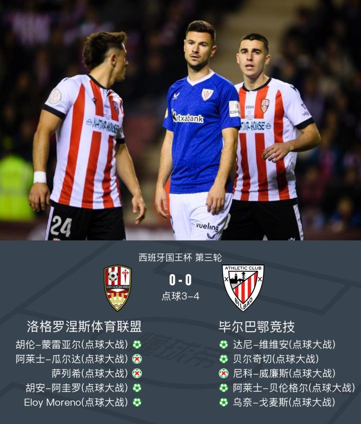 毕尔巴鄂竞技点球大战4-3洛格朗尼斯,尼科-威廉斯失点战报bot @懂球帝2025-01-05 07:14北京时间1月5日西班牙国王杯 第三轮,洛格罗涅斯体育联盟对阵毕尔巴鄂竞技。最终比分洛格罗涅斯体育联盟 3-4 毕尔巴鄂竞技。点击查看本场比赛详细数据>>点击查看国王杯完整积分榜>>球队阵容技术统计展开更多