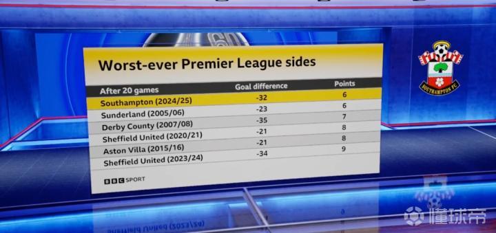 南安普顿前20轮仅积6分净胜球-32,创造英超历史同期最差成绩