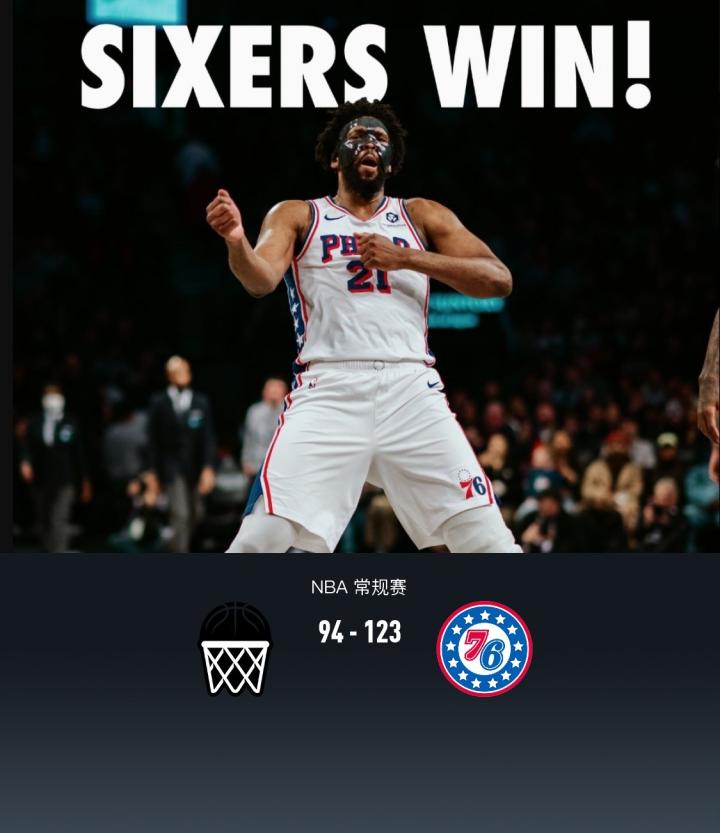 费城76人恩比德28分12板6助,马克西18分2板7助,凯勒布-马丁17分4板3助1断1帽。