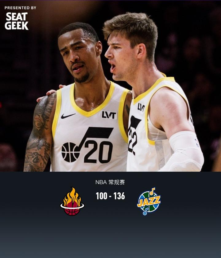 巴特勒缺阵,爵士136-100大胜热火,森萨博34+7+2