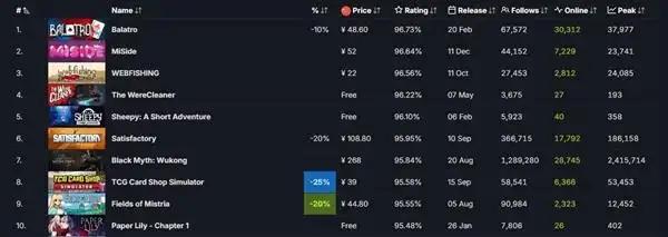 2024年发布的游戏中,《小丑牌》以96.73%的好评率位列Steam评分最高游戏榜单第一,《黑神话:悟空》以95.84%的好评率位列第七。