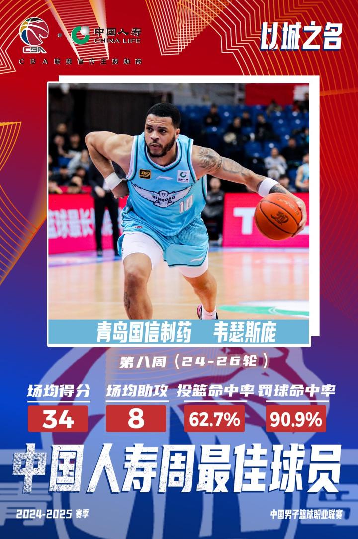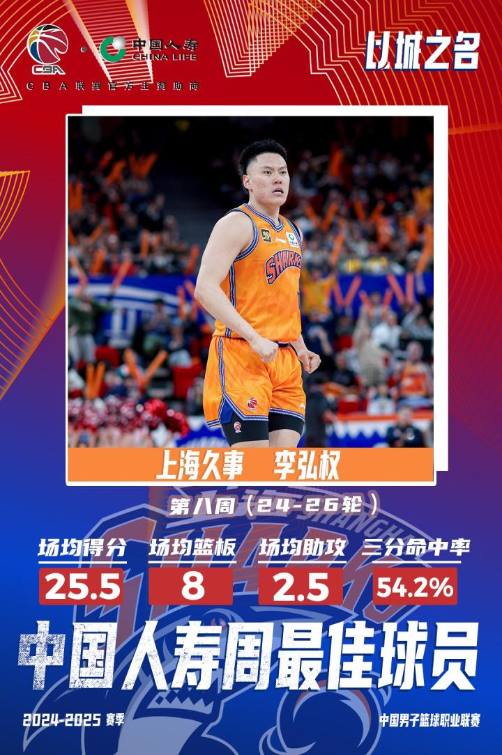北京时间1月5日,CBA官方公布2024-2025赛季CBA联赛常规赛第八周周最佳球员,上海男篮李弘权和青岛男篮外援韦瑟斯庞成功当选。
