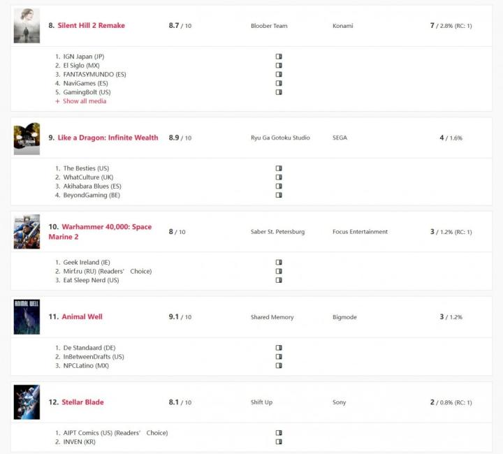 排名第四的是Atlus的《暗喻幻想:ReFantazio》,以24次获奖紧追在后。《黑神话:悟空》获奖20次,排行第五。