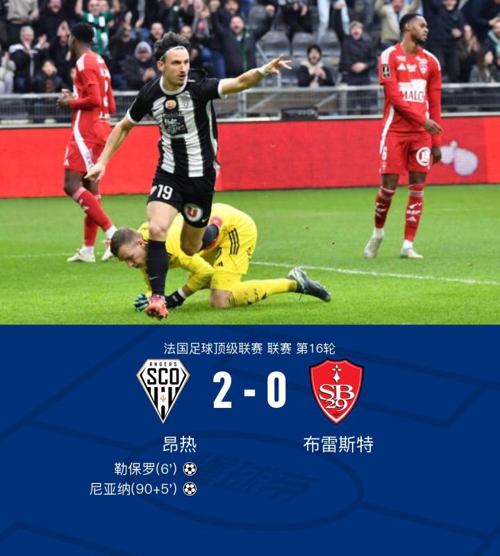 昂热2-0布雷斯特,勒保罗开场闪击,尼亚纳锁定胜局