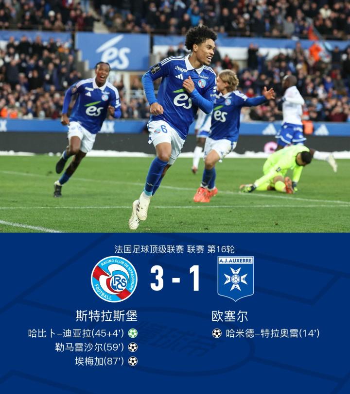 斯特拉斯堡3-1逆转欧塞尔,哈比卜-迪亚拉点射,勒马雷沙尔、埃梅加建功
