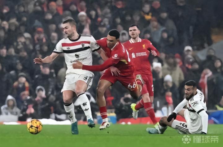 (图)加克波和麦卡利斯特先后叩关,阿莫林旋即调整了防守策略,曼联一边封堵肋部,一边加强防空,比赛很快就变成了阿诺德的“个人秀”。